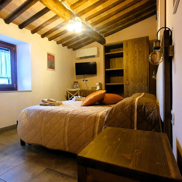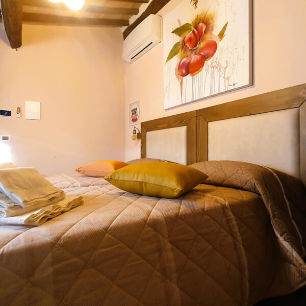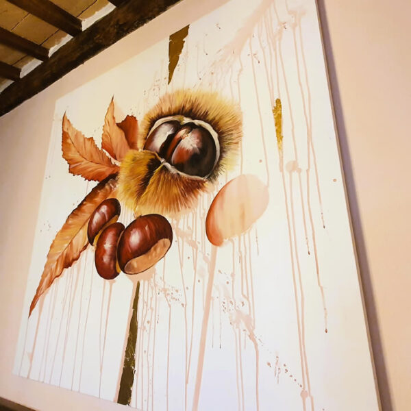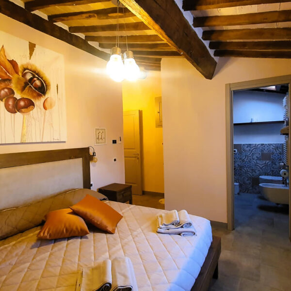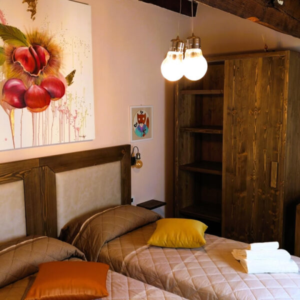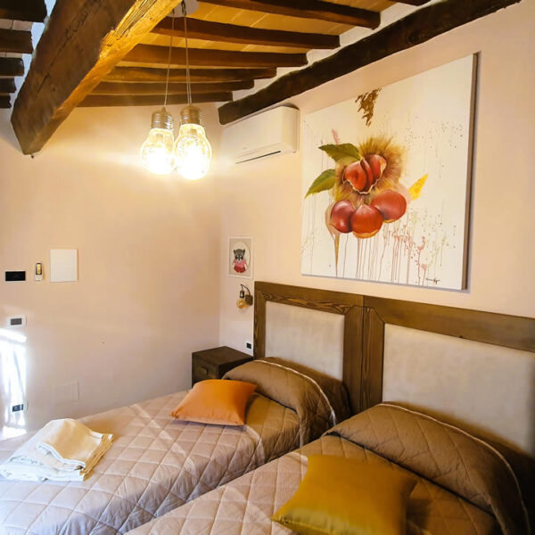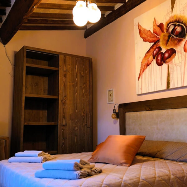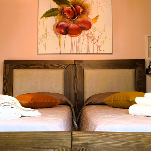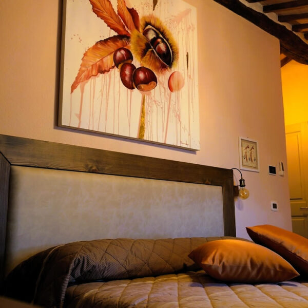 La terza sistemazione è “il castagneto”, una quadrupla, per famiglie, due camere, una con letto matrimoniale ed accesso diretto al bagno con doccia e l’altra una doppia con due letti singoli, frigobar e tv satellitare in tutte e due le camere, aria condizionata. A questa quadrupla abbiamo appunto dedicato la castagna, altro prodotto dell’azienda che risplende nei quadri sistemati sopra le testate dei letti delle due camere.