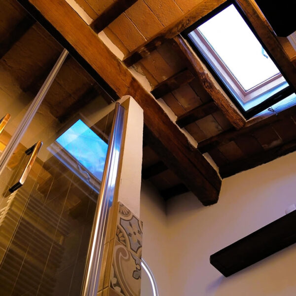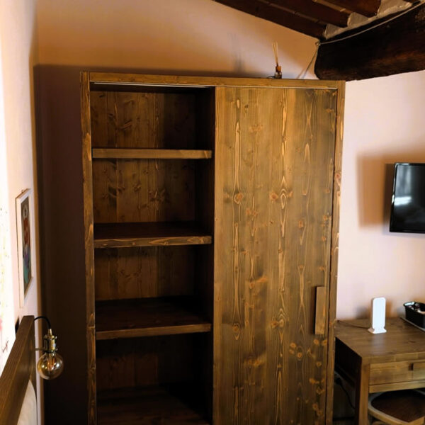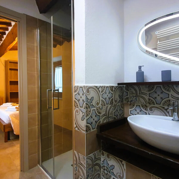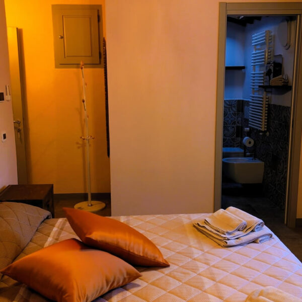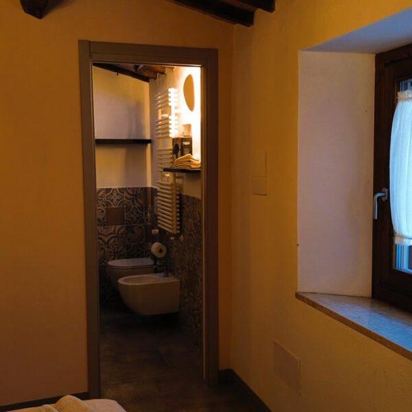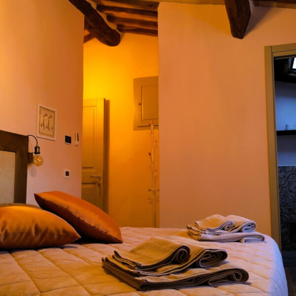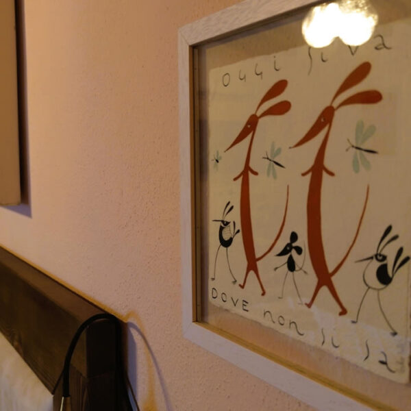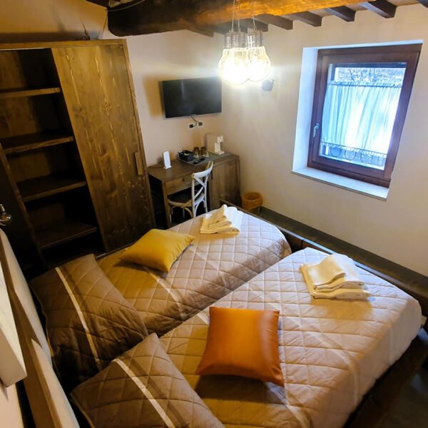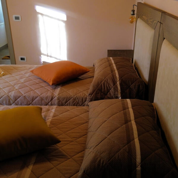 La terza sistemazione è “il castagneto”, una quadrupla, per famiglie, due camere, una con letto matrimoniale ed accesso diretto al bagno con doccia e l’altra una doppia con due letti singoli, frigobar e tv satellitare in tutte e due le camere, aria condizionata. A questa quadrupla abbiamo appunto dedicato la castagna, altro prodotto dell’azienda che risplende nei quadri sistemati sopra le testate dei letti delle due camere.